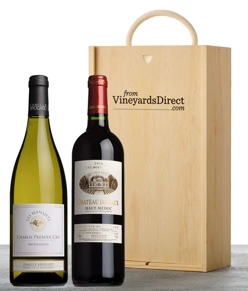 A two bottle gift containing our top Chablis and Claret, presented in a wooden gift box.