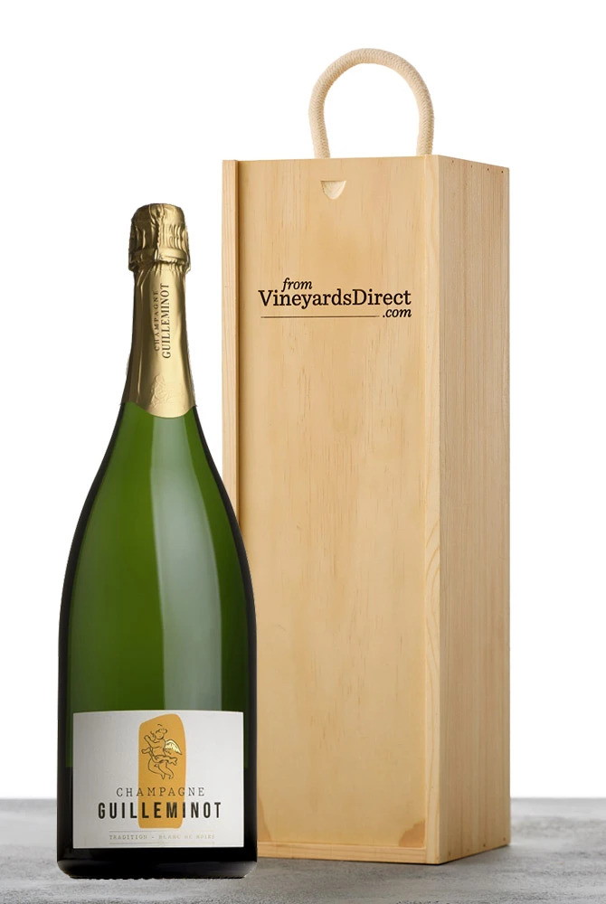 A magnum of Guilleminot Champagne, presented in a wooden gift box.