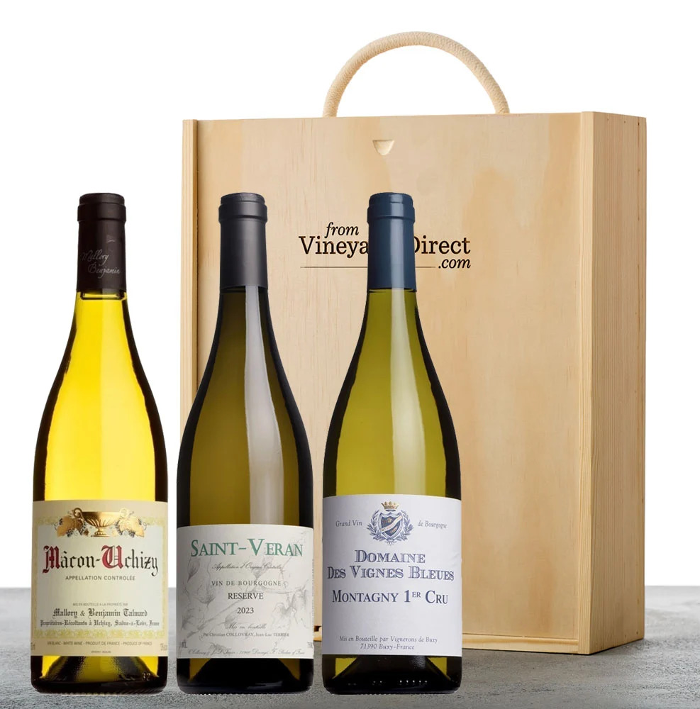 A three bottle selection of our White Burgundy wines, presented in a wooden gift box.