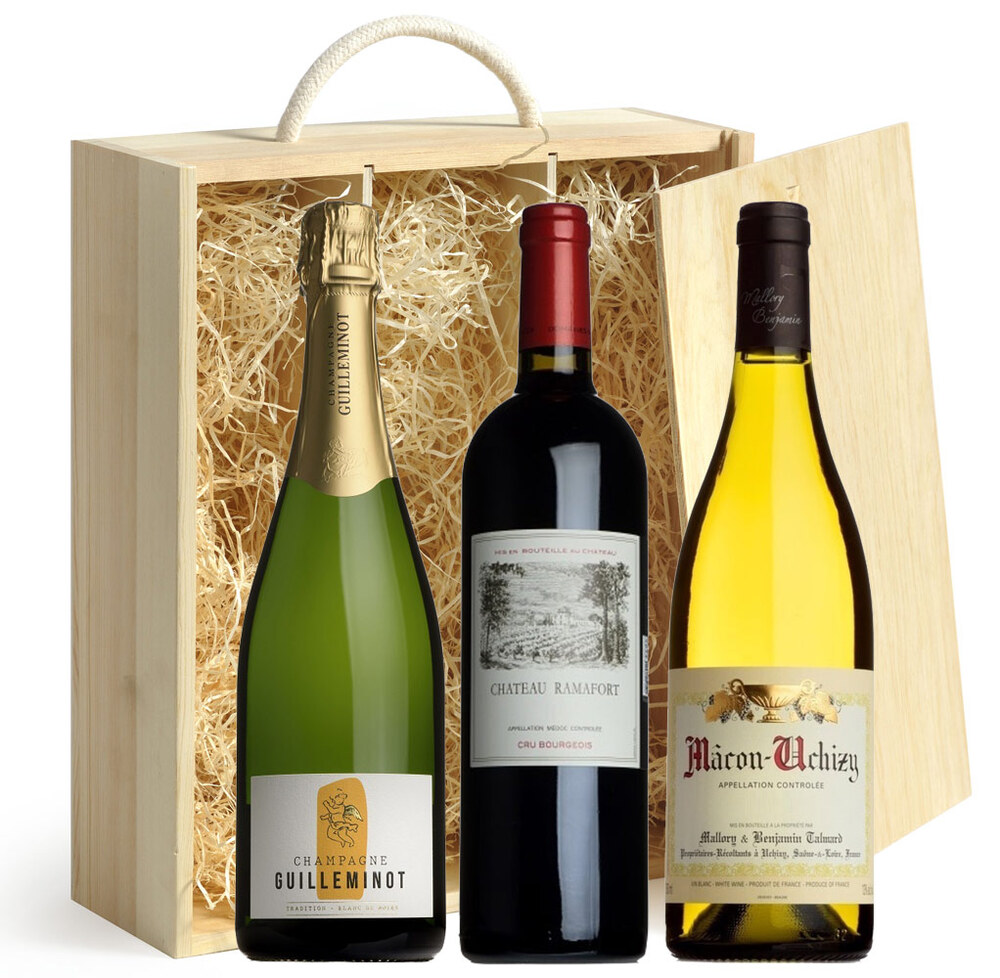 A three bottle selection of wine, presented in a wooden gift box.