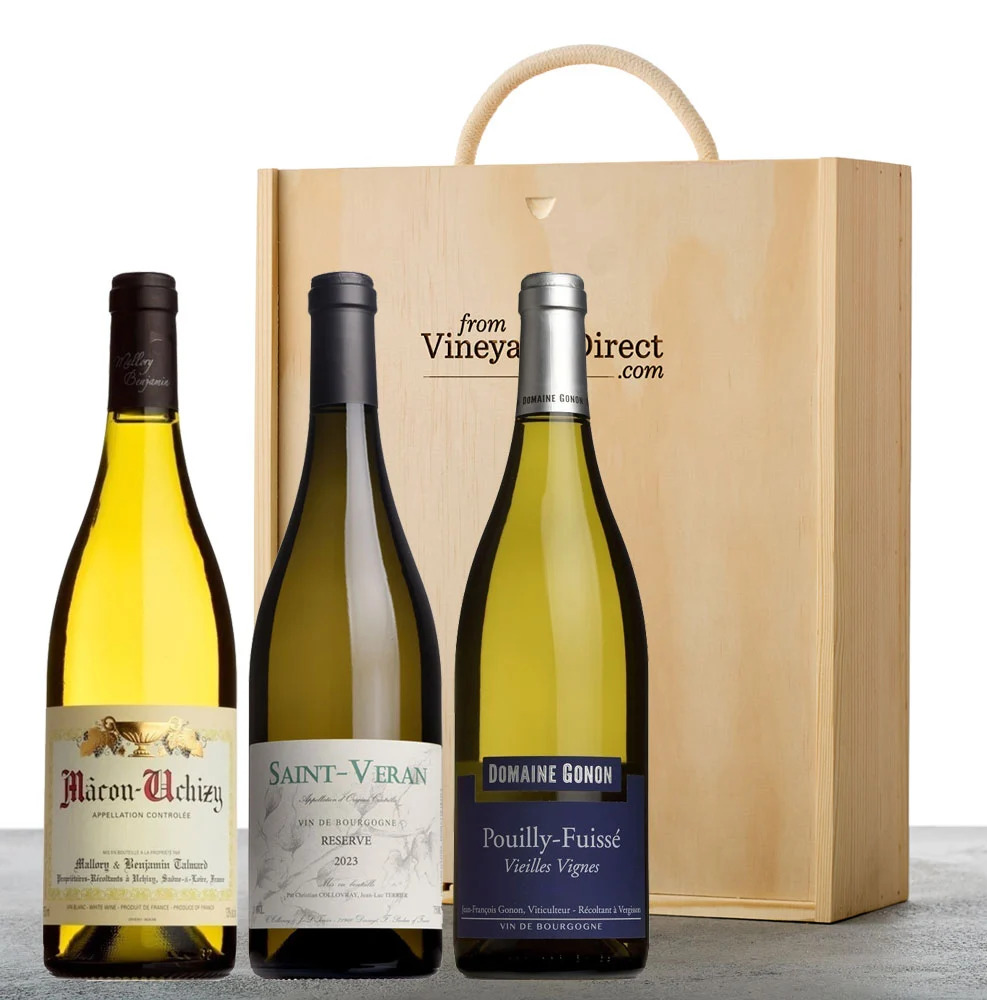 A three bottle selection of our White Burgundy wines, presented in a wooden gift box.